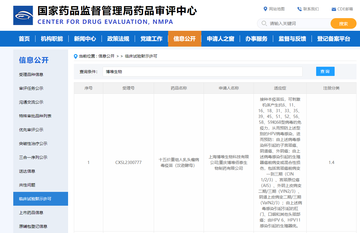 天勤生物助力博唯生物“十五價(jià)HPV疫苗(漢遜酵母)”獲臨床批件