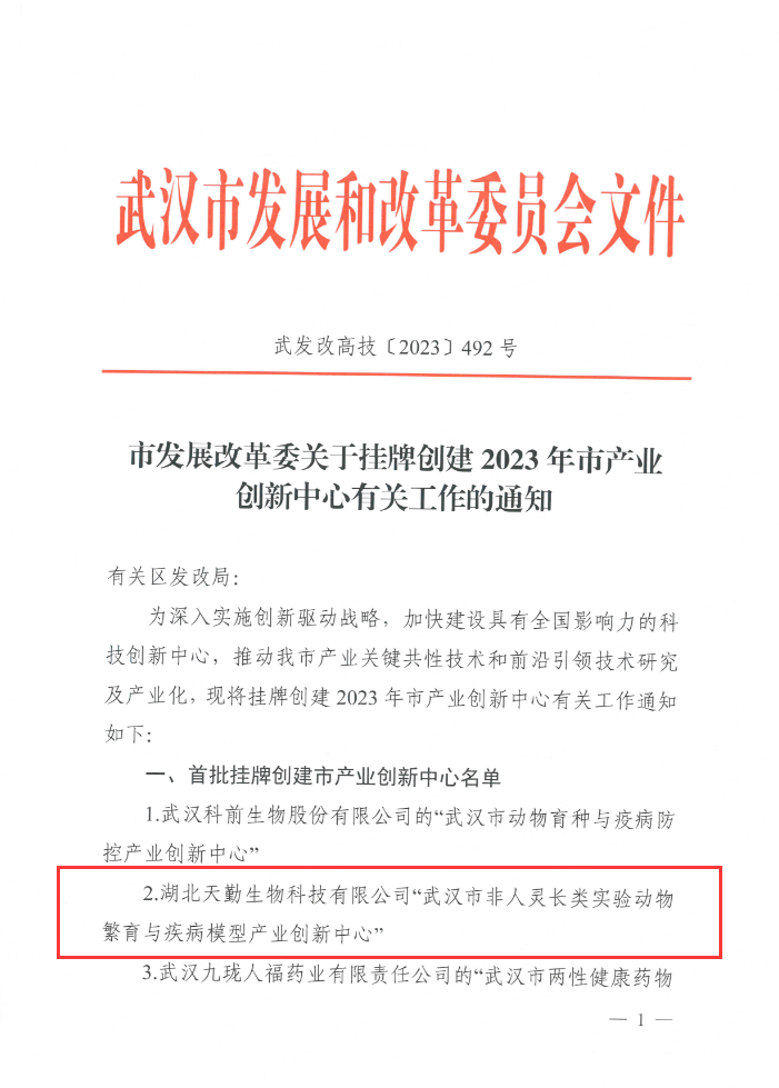 天勤生物“武漢市非人靈長(zhǎng)類(lèi)實(shí)驗(yàn)動(dòng)物繁育與疾病模型產(chǎn)業(yè)創(chuàng)新中心”成功獲批